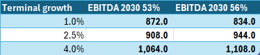 I apply a simple valuation method by following a Discounted Cash Flow (DCF) model valuation. I apply the margins and indicators stated above in the Financial Performance section and in the summary table above. I use my hurdle rate and benchmark as discount rate: 10%. And I apply a terminal growth of 2.5% - on the generous end but industry growth justifies it in this case. The DCF leads to an Enterprise Value of EUR 23.4bn, which accounting for a Net Cash of EUR 4.4bn results in a per share intrinsic value of EUR 908, very close to today’s share price of EUR 870. By playing with the EBITDA margin in 2030 and the terminal growth rate the result is as follows.