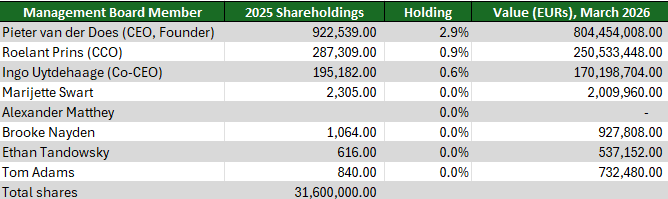 Management has skin in the game. CEO and Co-Founder Pieter van der Does has nearly EUR 1bn tied to Adyen, while the Chief Commercial Officer and the Co-CEO also hold a meaningful amount.