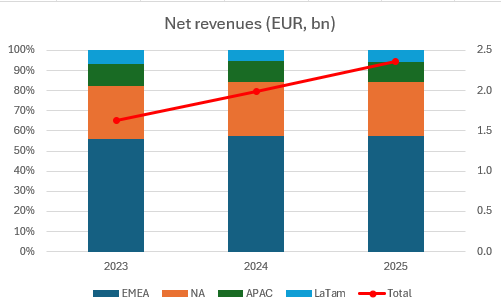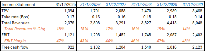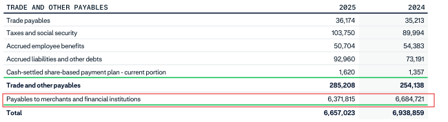 There is an important element to disclose. During the payment process, Adyen comes to hold meaningful balances of customer, or so called “In-transit” cash. This is not Adyen’s and shows as Cash and equivalents on their balance sheet, but also as a Payable to merchants and financial institutions in their balance sheet. On that, they earn a little of interest but due to the large amount of money moved, it was in the region of EUR 150-170m in 2025. Lower if interest rates go down, higher if they go up.