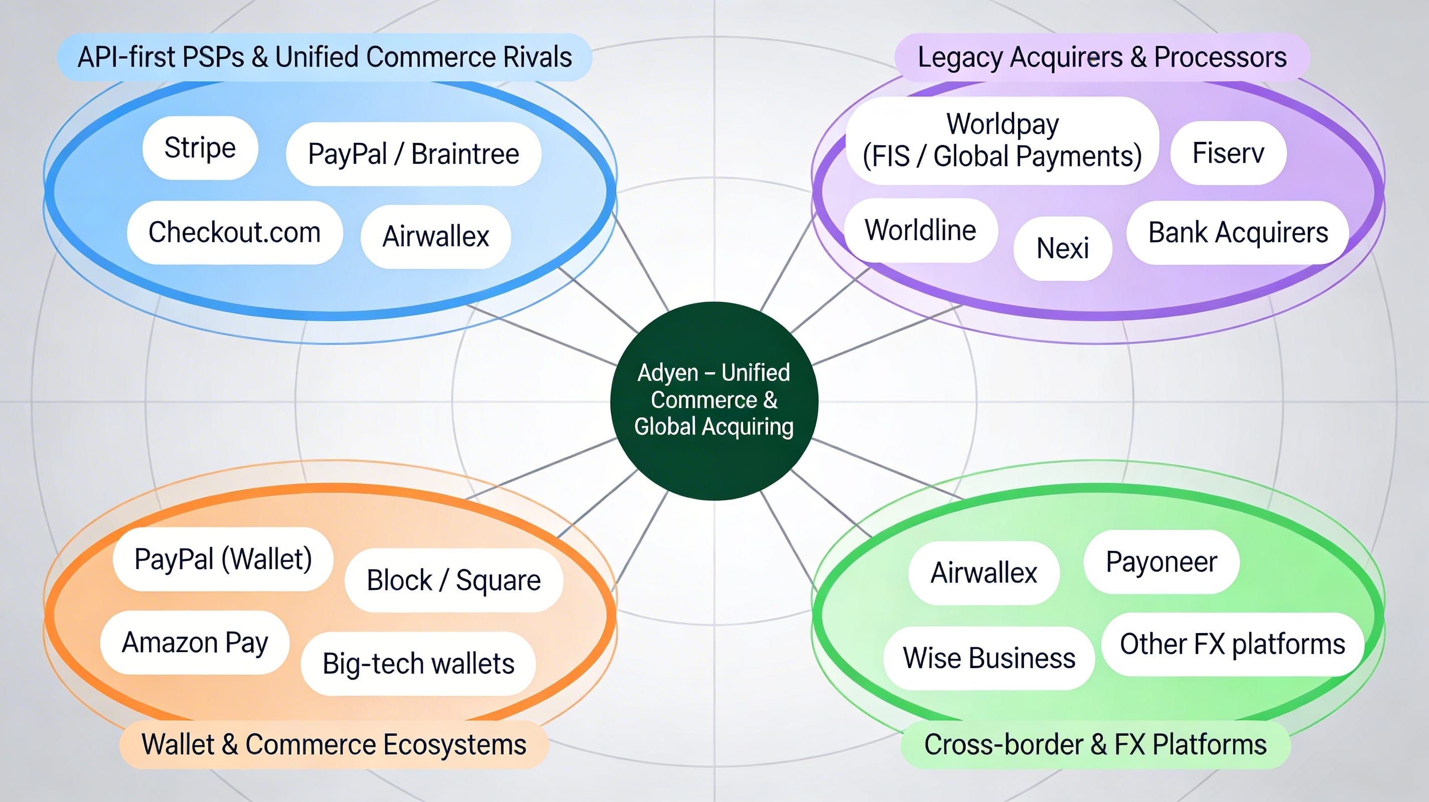Direct competitors are Stripe, Braintree (PayPal) or Checkout.com, that operate more modern tech stacks and are gaining new business, as well as taking business from the legacy providers. The legacy providers are also competitors, but those loose business to the likes of Adyen. WorldPay, Global Payments, Fiserv, Worldline, Nexi. Then there are wallet-centric competitors, such as PayPal Holdings (which leverages their PayPal / Venmo wallets), Block Square, the likes of Amazon Pay or Apple Pay. Cross-border payout / FX focused businesses such as Wise, Airwallex or Pioneer but this is more niche. And we can even include card schemes (Amex, Visa) and traditional banks that indirectly compete with some overlap in some of the functions, although not directly or fully competing. Therefore, clearly the first two categories are the competitive ones, with the newer players competing for new business and the legacy players giving up business for those new ones.