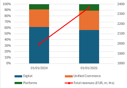 By type of client offering, Adyen breaks down its segments as Digital, Unified Commerce and Platforms.