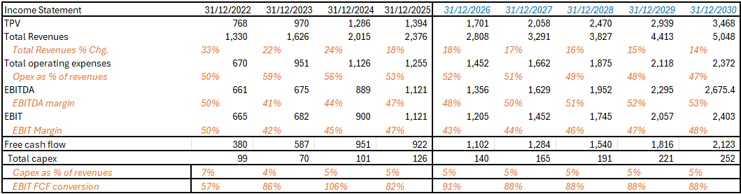 Adyen operates a relatively capital light model and a very profitable enterprise. EBITDA is in the 50% range, expected to tick upwards towards 55% in the next few years, while operating margin runs in the high 40s%, the difference being primarily depreciation, right-of-use depreciation and to some extent amortisation. Free cash flow conversion is in the 90% range.