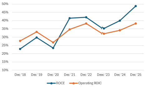Adyen shows improving returns on capital, as measured by ROCE and ROIC. While there is some divergence in the figures due to data inputted, the trends are clear and underscore the profitability of this business. An improving ROI metric often leads to improving margins.