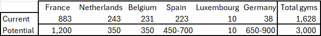 As for its presence, it has a strong presence in France and the Benelux but the potential and space to grow remains large, in particular in Spain and Germany. Overall, the company estimates being able to reach north of 3,000 gyms in these countries. Spain and Germany potential are in line with the low gym penetration levels in the population shown in the graph above.