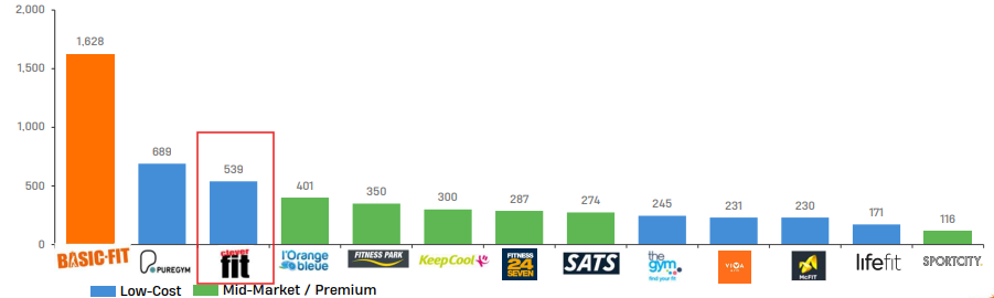 Basic Fit operates in the Benelux, France and Spain as core markets. It has further entered Germany, where it is taking market share at speed. Basic Fit operates under a strategy of clustering gyms, which means entering a city in one go with several gyms.