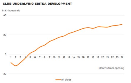 Example of a gym: Basic Fit spends about EUR 1.3m in a new gym. Over 3 years it will converge towards >3,000 members, a which point it will generate around EUR 1m in revenue. Deducting from that operating expenses (gym staff and rent) leads to a Club EBITDA less rent of EUR 460k / year, which divided by the initial investment equates to a ROIC of 37%.