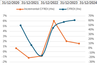 Below we have 2 measures: CFROI or Cash From Operations divided by Capital Employed (blue, lhs) and Incremental CFROI (orange, rhs), which measure the changes in CFROI and is an excellent measure of how recent capital is generating returns. Since the covid debacle, CFROI is increasing steadily. This is a lagging indicator as it incorporates past information but if it increases it means that recent CFROI is higher than previous ones. However, Incremental CFROI has jumped to double digit territory and that is what matters. Capital employed over the last 3 years is returning >10% on investment, which over time is what shareholders should expect to receive.