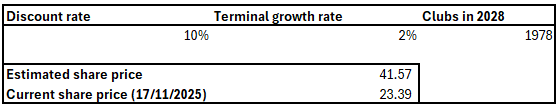 I value Basic Fit based on a DCF model first, my favoured approach. The assumptions are that by end-2028 it reaches 1,978 gyms with per Club EBITDA at EUR 370k, of which mature clubs at EUR 430k. I discount cash flows at 10%, my hurdle rate, and apply a terminal growth of 2%. Therefore, in 2028 Basic Fit would make EUR 1.9bn in revenues, EUR 510m in cash from operations, and a maintenance free cash flow (with no growth capex) of EUR 363m - which I use to derive the terminal value. Based on my estimates, I derive a share price closer to EUR 40, far above the current share price of EUR 23.
