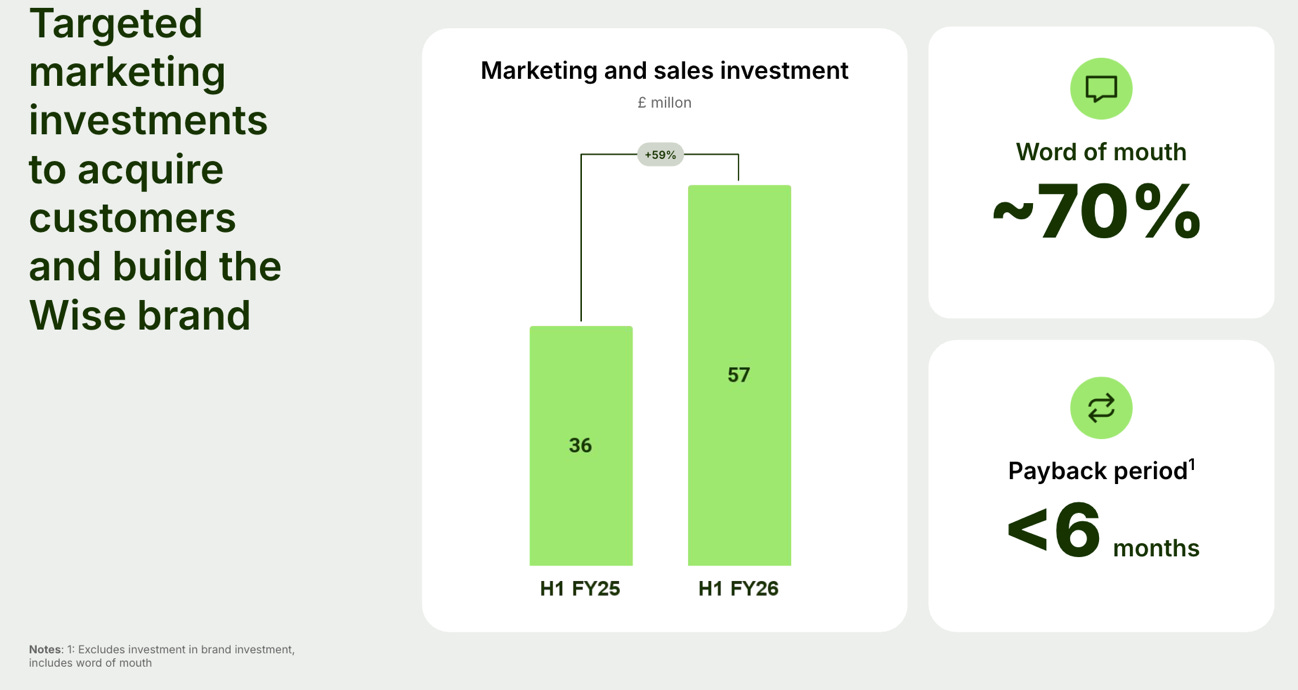 Being the lowest cost operator in the industry is very important and gives Wise an essential competitive advantage: their customers mainly come from word of mouth (about 70% of them). Hence, without spending as much as competitors like Remitly, they can match its competitor’s users growth. Despite this, the company is now entering a phase of higher marketing expenses to acquire more customers. Wise also indicates that the payback period is of less than 6 months.